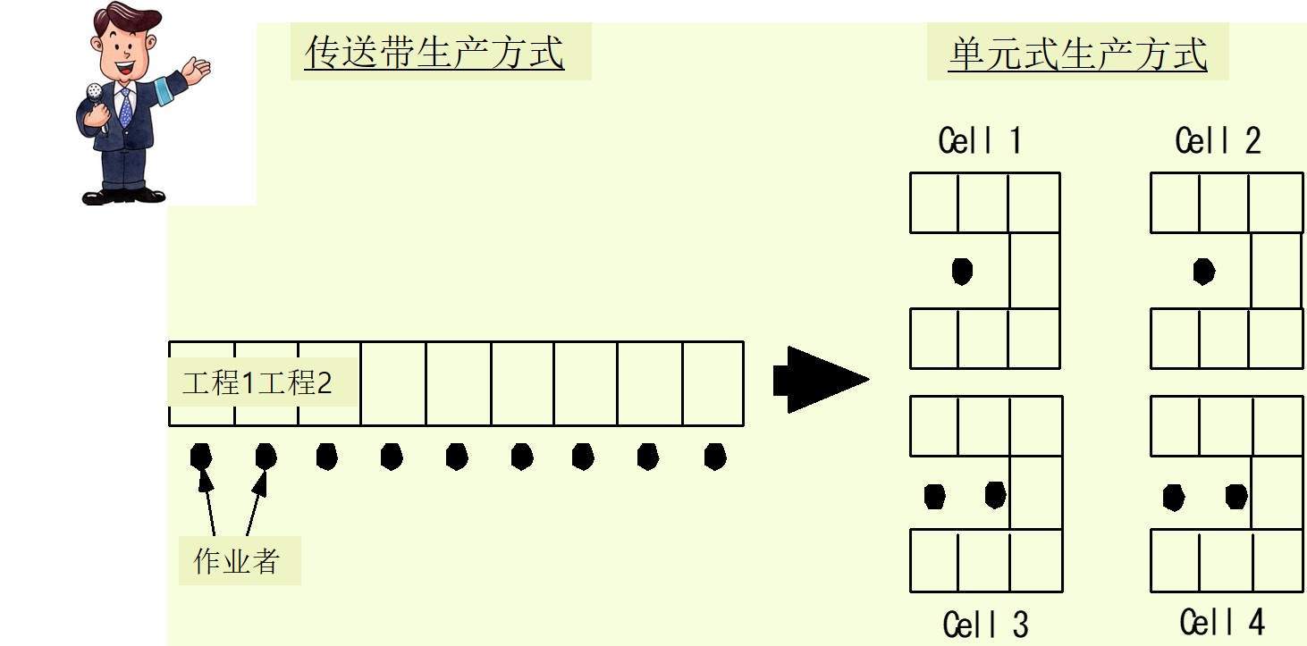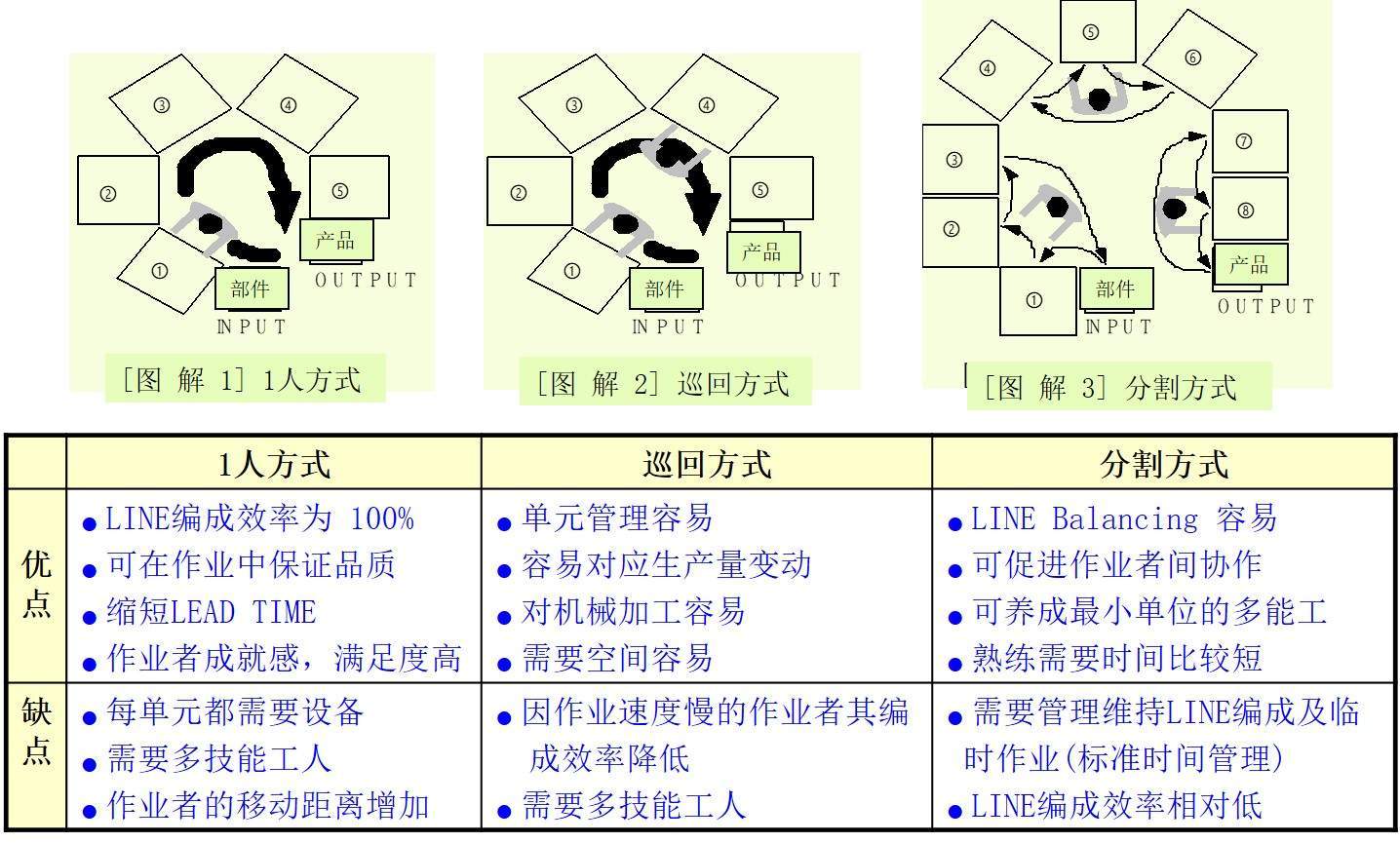 單元生產(chǎn)方式的定義 :是指無傳送帶LINE,從頭到尾由作業(yè)者負責執(zhí)行業(yè)務的自己完結(jié)型的生產(chǎn)方式。