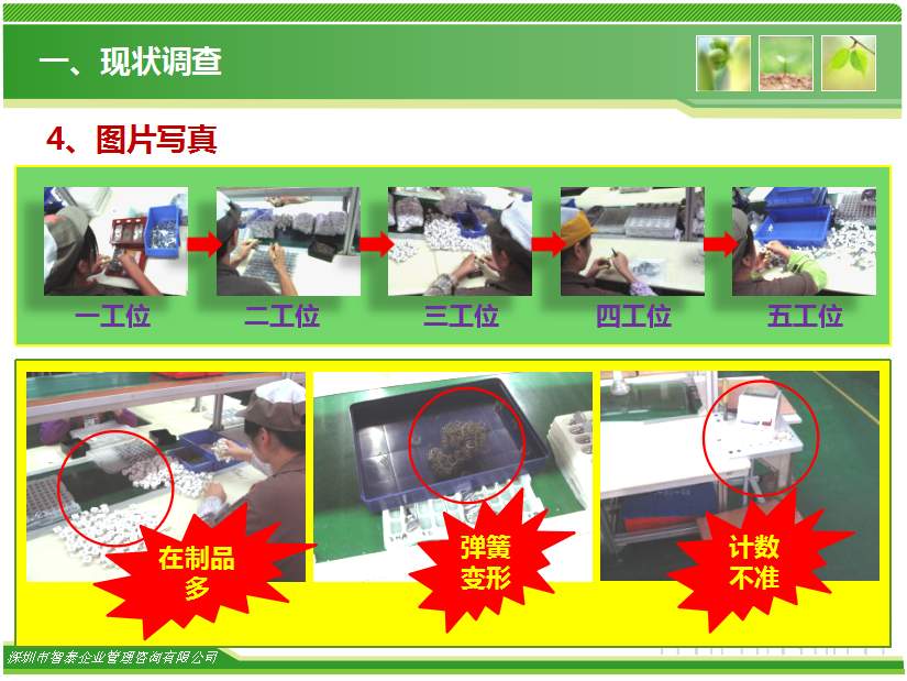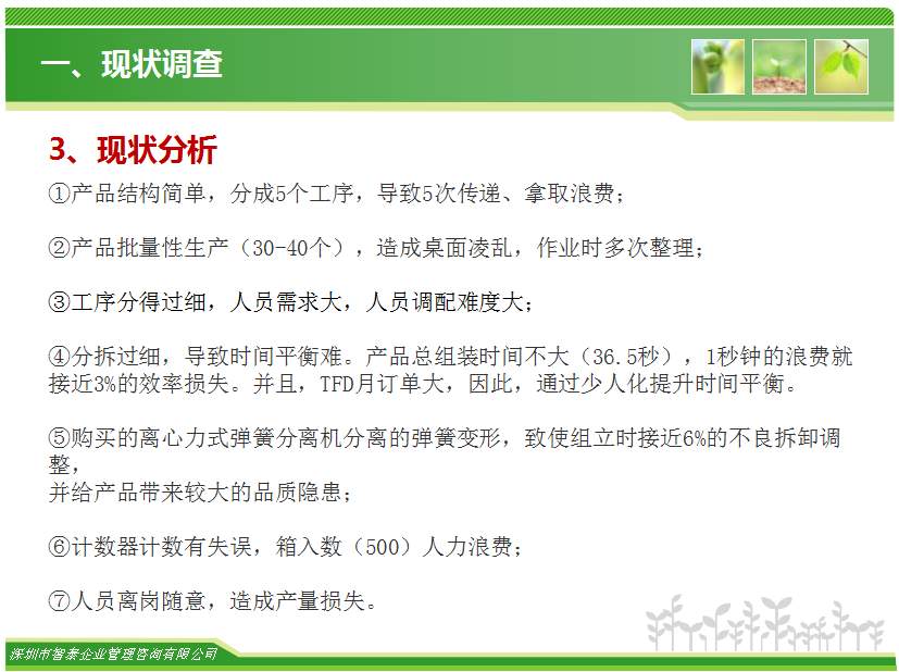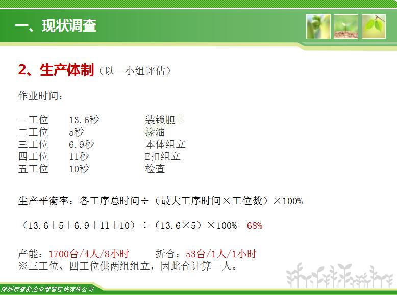 在精益生產(chǎn)中車間經(jīng)常要改進(jìn)的內(nèi)容是生產(chǎn)線上的生產(chǎn)平衡率問題,目前國內(nèi)加工型企業(yè)的生產(chǎn)平衡率只有65%左右,對于智泰專業(yè)團(tuán)隊(duì)來說,這里面的改善空間巨大,通過智泰人的努力,在企業(yè)推進(jìn)生產(chǎn)平衡率平均提升到85%以上,階段為生產(chǎn)效率提升案例,請查閱: