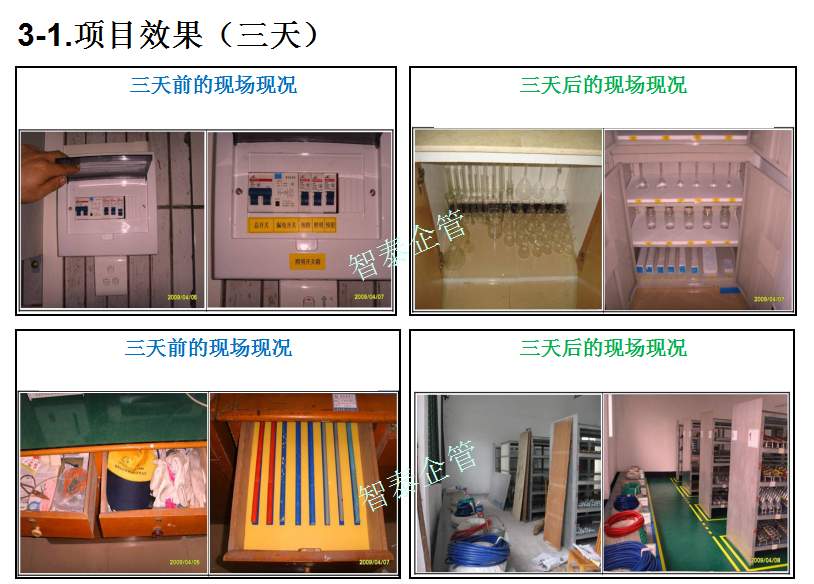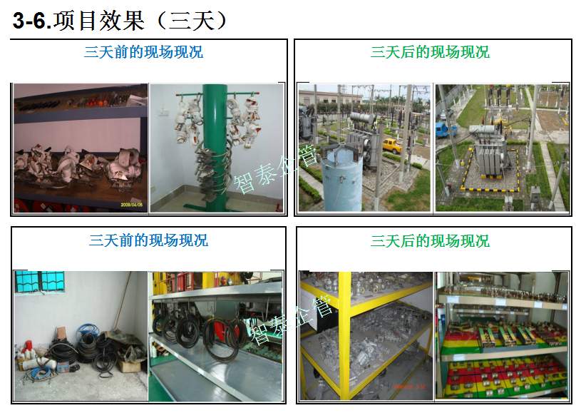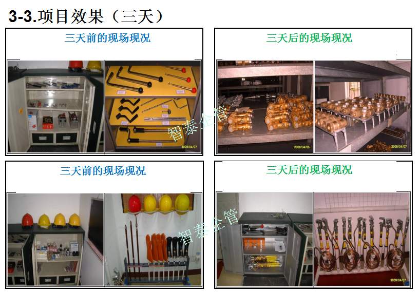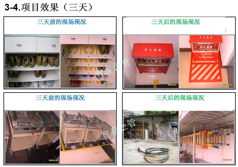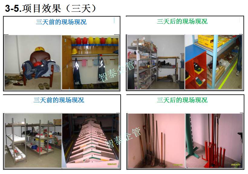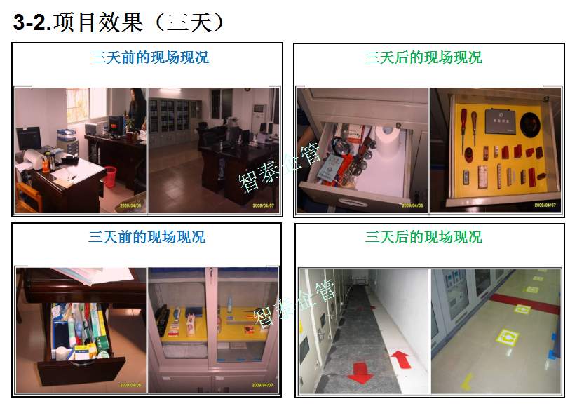 智泰咨詢下屬的5S管理公司首創(chuàng)的產(chǎn)品三天一標(biāo)桿,三天一條線,三天締造6~8個(gè)標(biāo)桿車間,智泰咨詢專業(yè)的顧問(wèn)團(tuán)隊(duì)為企業(yè)的5S管理快速打造已形成一套標(biāo)準(zhǔn)內(nèi)容,能夠快速在企業(yè)全面推進(jìn)5S管理,附件為智泰咨詢?yōu)槟称髽I(yè)快速打造5S管理樣板區(qū)三天前后對(duì)比的現(xiàn)況,請(qǐng)查閱: