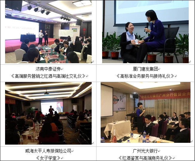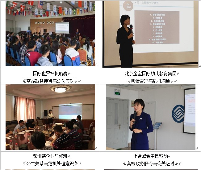 青島日?qǐng)?bào)社、青島電視臺(tái)、青島人民廣播電臺(tái)、青島新聞網(wǎng)、帆船賽世界杯、青島市海洋節(jié)、青島國(guó)際帆船、中國(guó)石化、中國(guó)銀行、招商銀行、勞斯萊斯、賓利、奔馳、本田、海信集團(tuán)、海爾集團(tuán)、一汽大眾上海市人民政府機(jī)關(guān)企事業(yè)單位青島市政府、青島市體育局、百名海外院士青島行、克利伯環(huán)球帆船賽青島站、多家國(guó)企、民企、上市、跨國(guó)企業(yè)及政府單位的危機(jī)公關(guān)和高端服務(wù)禮儀特聘講師/顧問。