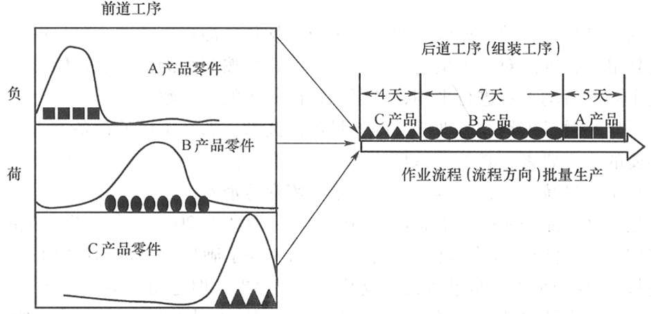 為避免浪費,后道工序不應(yīng)采用集中連續(xù)的順序裝備同一產(chǎn)品,而應(yīng)采用在某一時間單位內(nèi)各品種出現(xiàn)的比率均等的順序進(jìn)行裝配(采用混流生產(chǎn)),即均衡化生產(chǎn)。這樣前道工序的負(fù)荷就會減少,每日平均生產(chǎn)成為可能。如下圖: