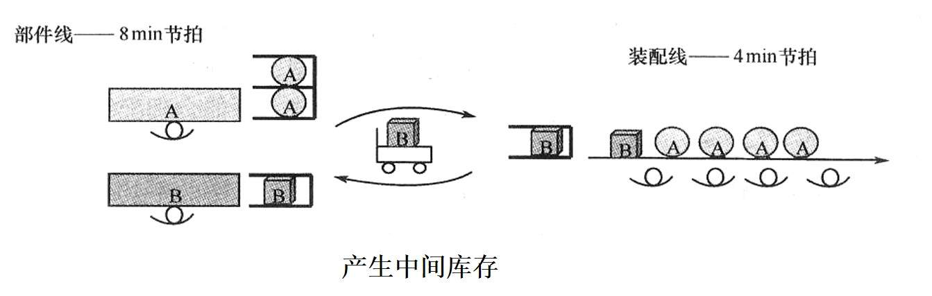 (1)如果按照準(zhǔn)時化的生產(chǎn)要求進(jìn)行生產(chǎn),當(dāng)后工序裝配線裝配B型車時,需要使用B部件,則生產(chǎn)A部件的生產(chǎn)線等待,反之亦然,這樣就造成了等待的浪費。