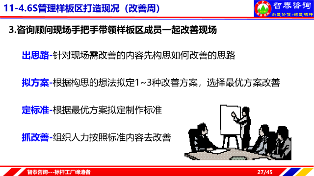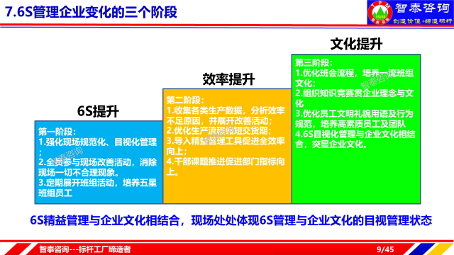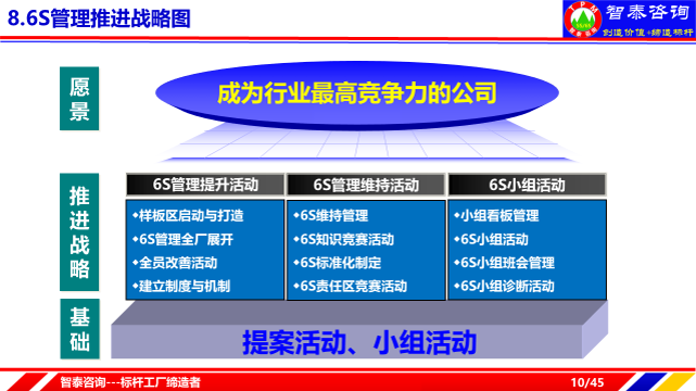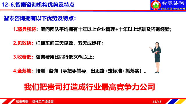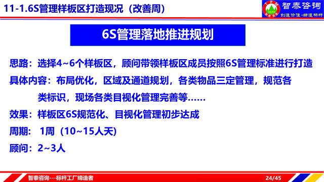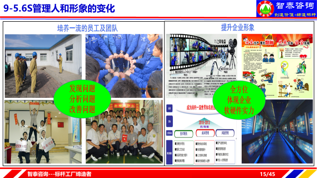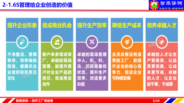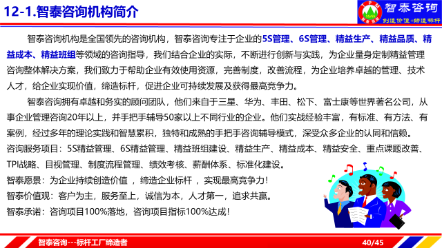 智泰咨詢機(jī)構(gòu)提供專業(yè)的5S管理,6S管理,TPM管理,精益生產(chǎn)管理的咨詢與培訓(xùn)服務(wù);我們有一批從事企業(yè)管理咨詢20年以上的資深顧問,他們行業(yè)經(jīng)驗(yàn)豐富,成功案例多,是真正落地的咨詢機(jī)構(gòu),我們給企業(yè)打造一流的目視化現(xiàn)場管理,確保企業(yè)隨時(shí)可參觀可審廠,提高企業(yè)的效率和品質(zhì),降低企業(yè)成本,我們幫您解決企業(yè)管理的一切問題!