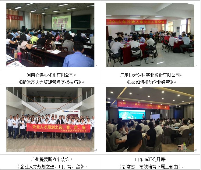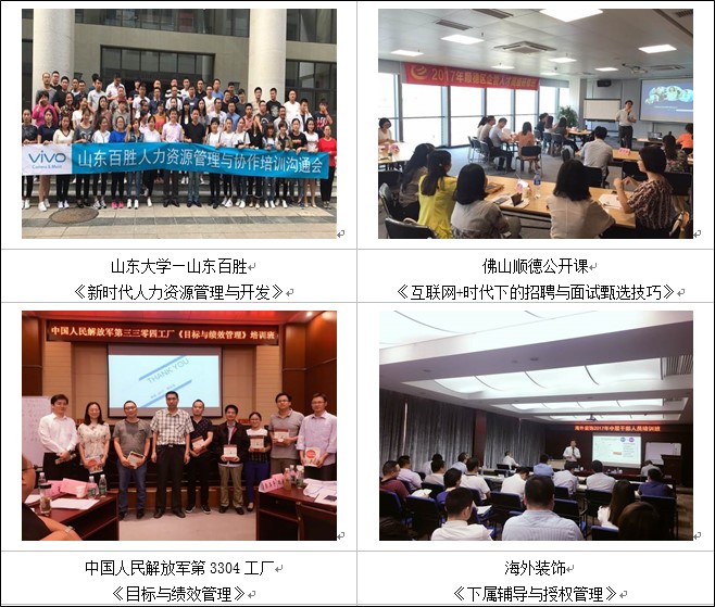 楊老師服務(wù)的客戶遍布北京、天津、上海、深圳、廣州、成都、南京、杭州、武漢、鄭州、沈陽(yáng)、哈爾濱、長(zhǎng)春、長(zhǎng)沙、西藏、蘭州、銀川、福州等地200以上企業(yè),為中核工業(yè)集團(tuán)、三星中國(guó)、中國(guó)移動(dòng)、中國(guó)電信、中國(guó)聯(lián)通、中鐵建工集團(tuán)、中國(guó)重汽、美的集團(tuán)、中國(guó)郵政、中國(guó)郵儲(chǔ)、中通通訊、中國(guó)建設(shè)銀行、中國(guó)工商銀行、中國(guó)農(nóng)業(yè)銀行、中信銀行、柳工集團(tuán)、陽(yáng)光保險(xiǎn)、華美集團(tuán)、中通通訊、惠豐機(jī)電、建滔化工集團(tuán)、金威啤酒集團(tuán)、富士康集團(tuán)、美的集團(tuán)、巴士集團(tuán)、重慶電工、遵義卷煙、共進(jìn)電子、廣州恒大集團(tuán)、廣州粒上皇食品、廣西路橋集團(tuán)、河南心連心化肥、南寧威寧投資集團(tuán)、南沙海城貨代、順豐快遞、廣東省各地人才交流中心、清華大學(xué)國(guó)際MBA教學(xué)中心、武漢大學(xué)干部培訓(xùn)中心、華中科技大學(xué)MBA教學(xué)中心、華東理工大學(xué)培訓(xùn)中心、蘭州大學(xué)研究生院、河北工業(yè)大學(xué)、廈門大學(xué)、上海交通大學(xué)、西南交通大學(xué)干部培訓(xùn)中心等多家高校EMBA班授課和多家大中型企事業(yè)單位進(jìn)行中、高層領(lǐng)導(dǎo)加力與管理技能、人力資源管理技能及職業(yè)素養(yǎng)提升、陽(yáng)光心態(tài)培訓(xùn)超700余場(chǎng)次。