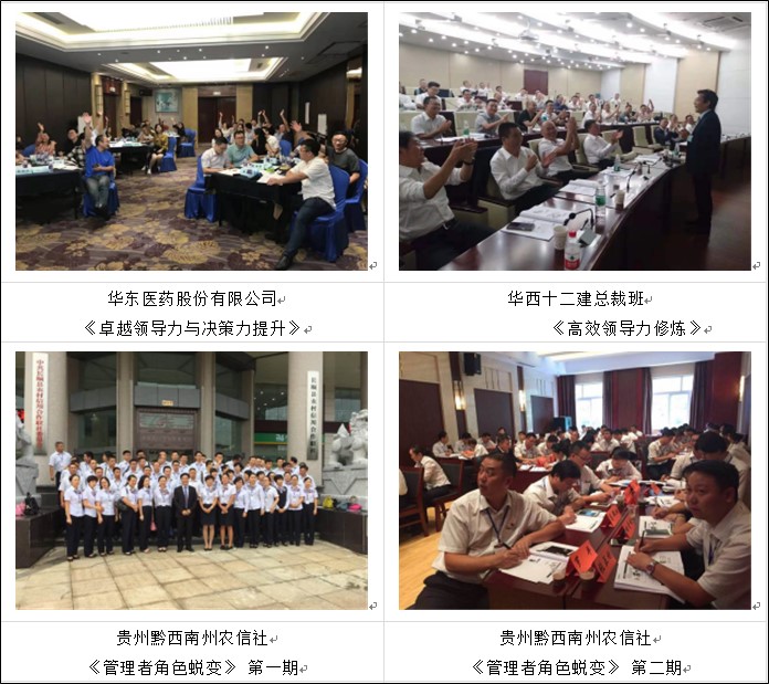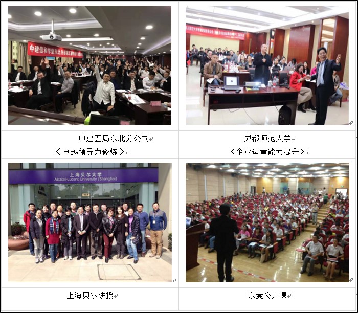 高校與政府機(jī)構(gòu):山西電力黨校、深圳清華大學(xué)研究院、清華大學(xué)PE總裁班、中山大學(xué)(MBA)廣州研究院、中山大學(xué)(MBA)江門研究院、西點執(zhí)行力學(xué)院、武漢大學(xué)經(jīng)管學(xué)院EDP、東莞黃岡貴族理想學(xué)校、深圳市學(xué)知文化、南昌財經(jīng)大學(xué)、上海交通大學(xué)、蘇州大學(xué)、新疆財經(jīng)大學(xué)、涼山州國資委……