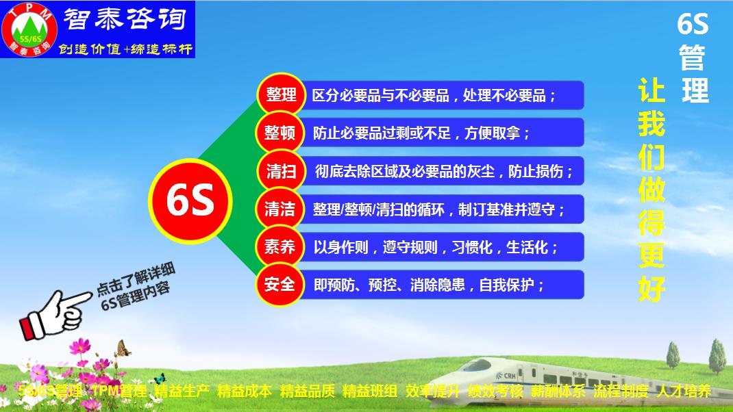 智泰咨詢公司在企業(yè)推進(jìn)6S管理中,為了確保6S管理能夠快速展開并結(jié)出成果,還會(huì)導(dǎo)入其它的管理工具來輔助6S管理的推進(jìn)。以下是各個(gè)管理工具的簡(jiǎn)介。