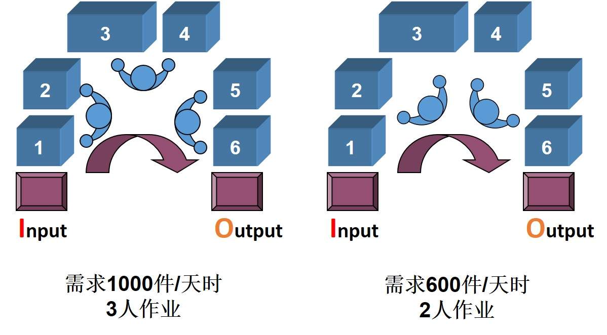 在傳統(tǒng)生產(chǎn)方式中,工人通常只會操作一種設(shè)備。當A設(shè)備的生產(chǎn)能力很強而B設(shè)備的生產(chǎn)能力較弱時,很容易造成A設(shè)備的操作工人空閑而B設(shè)備的操作工人過于繁忙,從而導致生產(chǎn)不均衡。因此,“一個流”生產(chǎn)要求工人能夠操作多臺生產(chǎn)設(shè)備,通過培養(yǎng)多能工來均衡整個生產(chǎn)節(jié)拍。此外,培養(yǎng)多能工還有利于人員的增加或減少。