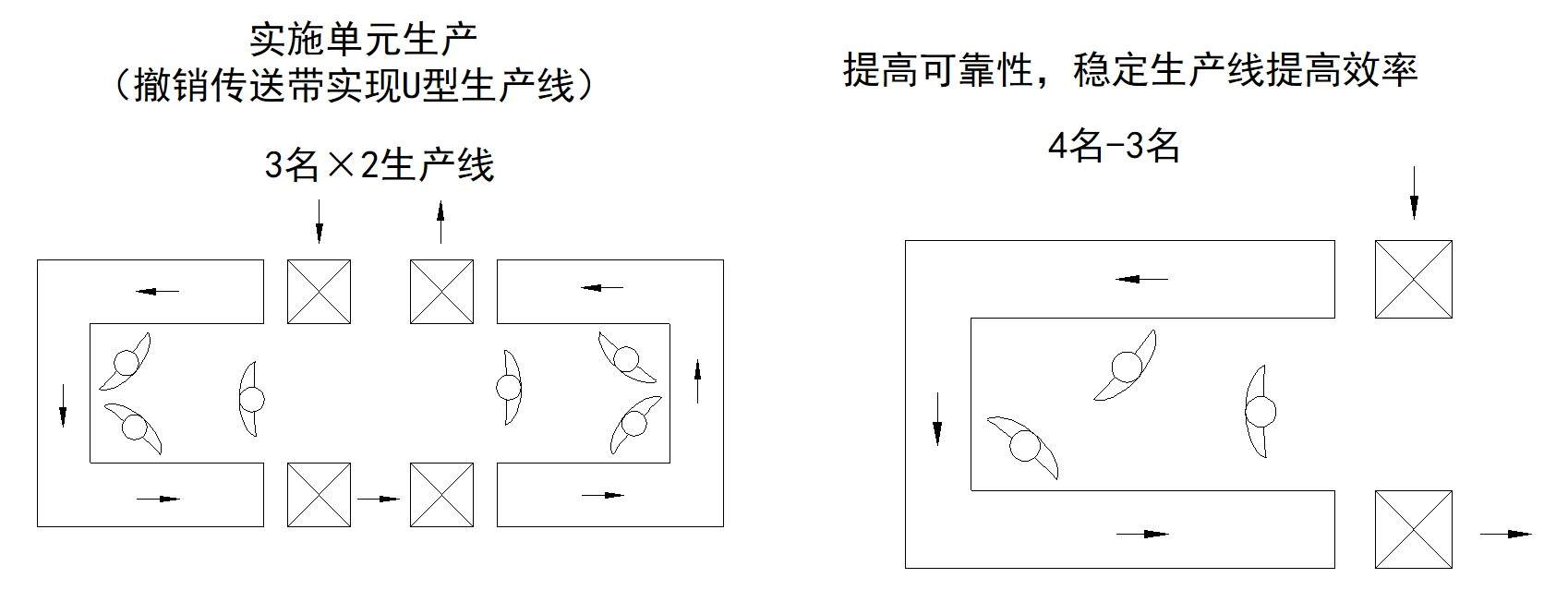 如果將生產(chǎn)設(shè)備一字擺開,工人從第一臺設(shè)備到最后一臺設(shè)備就需要走動很遠的距離,從而造成嚴重的人力浪費。因此,“一個流”生產(chǎn)要求將生產(chǎn)設(shè)備按照“U”字型來排列,從入口到出口形成一個完整的“U”型,這樣就可以大量的減少由于不同工序之間的傳遞而造成的走動,減少時間和搬運的浪費,增加生產(chǎn)效率。