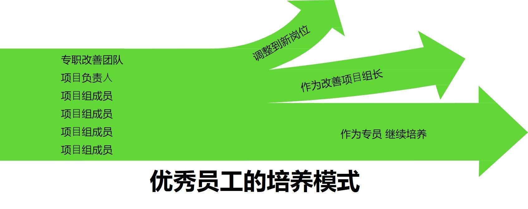 各分車間選撥專職人員,首先作為改善提案和核心人員或?qū)T進行培養(yǎng),接受咨詢顧問和推進辦的指導(dǎo),承擔(dān)部門內(nèi)項目負責(zé)人或項目成員的角色,根據(jù)在項目中的表現(xiàn),調(diào)整到合適的新崗位或晉升(繼續(xù)專職或兼職改善工作)