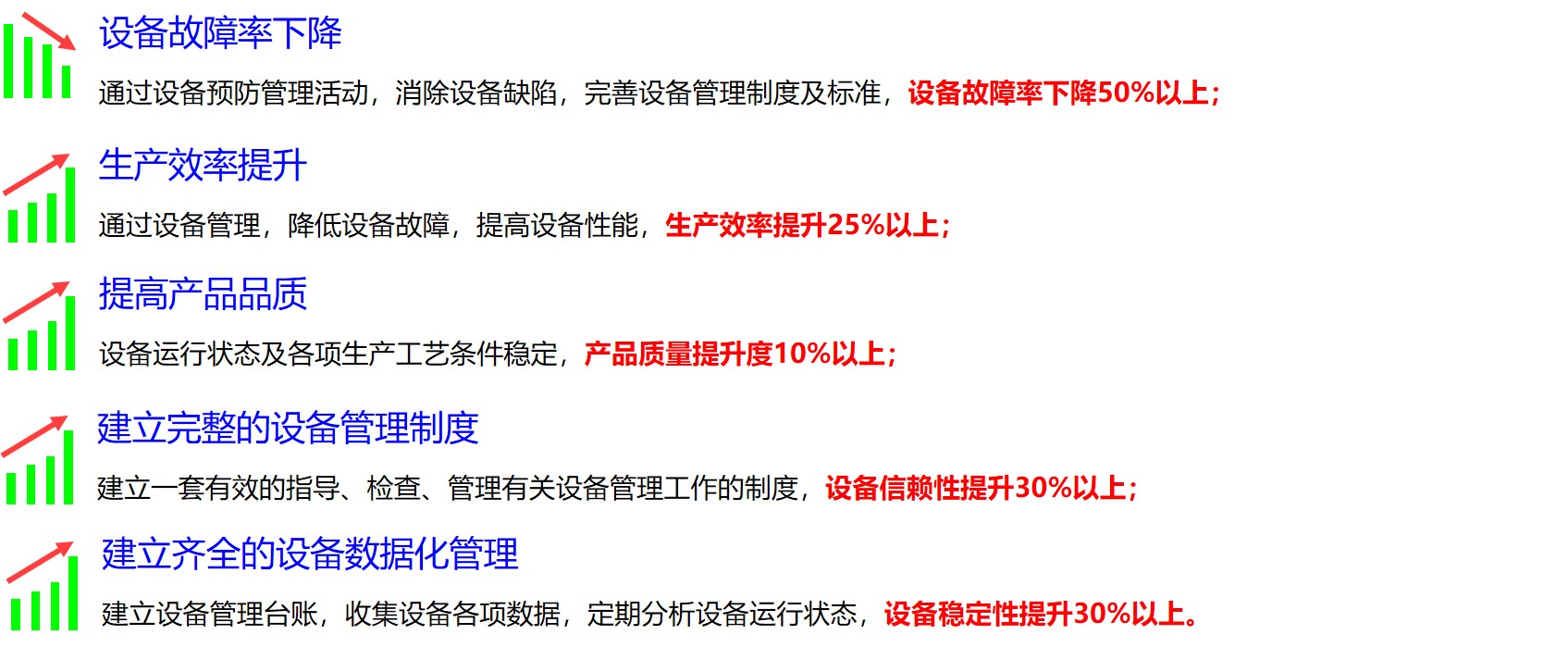 生產(chǎn)效率提升50%以上;產(chǎn)品質(zhì)量提升度30%以上;生產(chǎn)經(jīng)營(yíng)成本下降10%以上;設(shè)備故障率下降70%以上---確保成為行業(yè)標(biāo)桿和最高競(jìng)爭(zhēng)力企業(yè)。